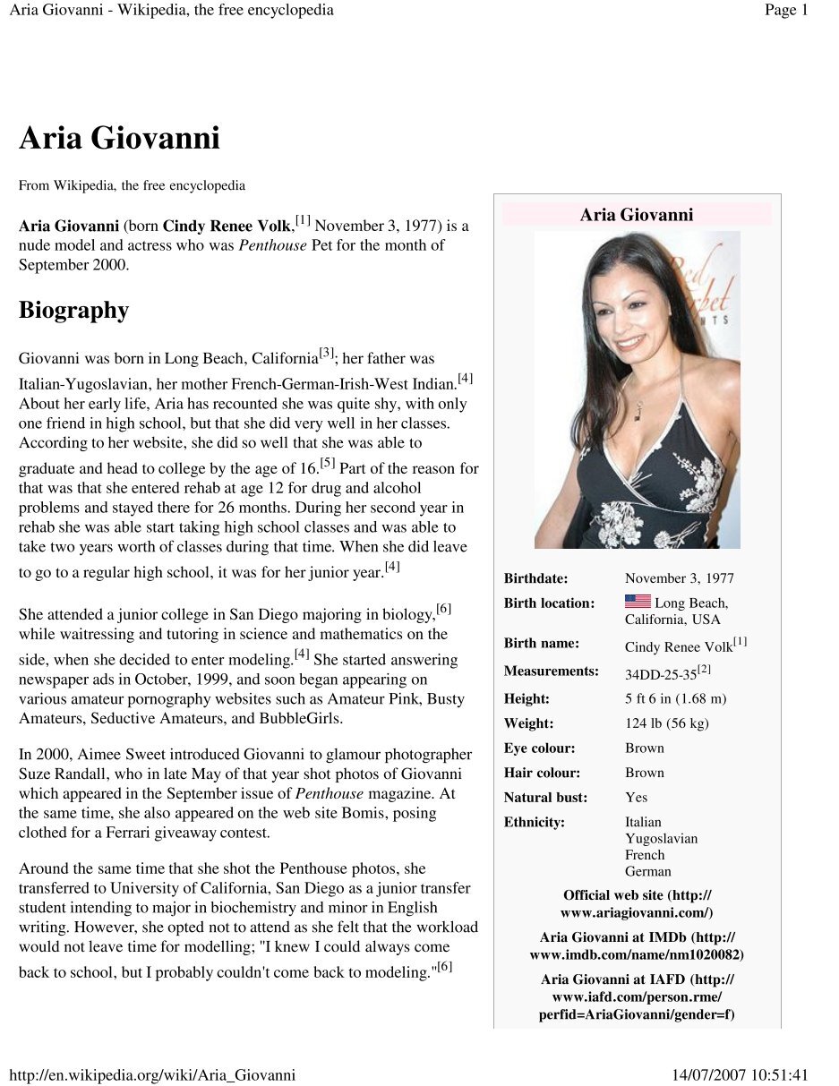 Aria Giovanni Wiki and Bio. Aria Giovanni born November 3 1977 is an American erotic actress and model who was Penthouse magazines Pet for the month of September 2000. She has modelled in a range of photographic styles including amateur artistic nude pinup fetish and glamour and has also had roles in films and television shows. Living in own house. 2006 summer special FEMME FATALES magazine UNREAD - NIKKI NOVA - ARIA. Aria Giovanni born November 3 1977 is an American erotic actress and model who was Penthouse magazines Pet for the month of September 2000. Aria Giovanni HusbWife and Children. Aria Giovanni born November 3 1977 is an American erotic actress and model who was Penthouse magazines Pet for the month of September 2000. Know more about Aria Giovanni Wiki Net Worth Age Family Children Son Daughter Parents Father Mother Siblings Sister.